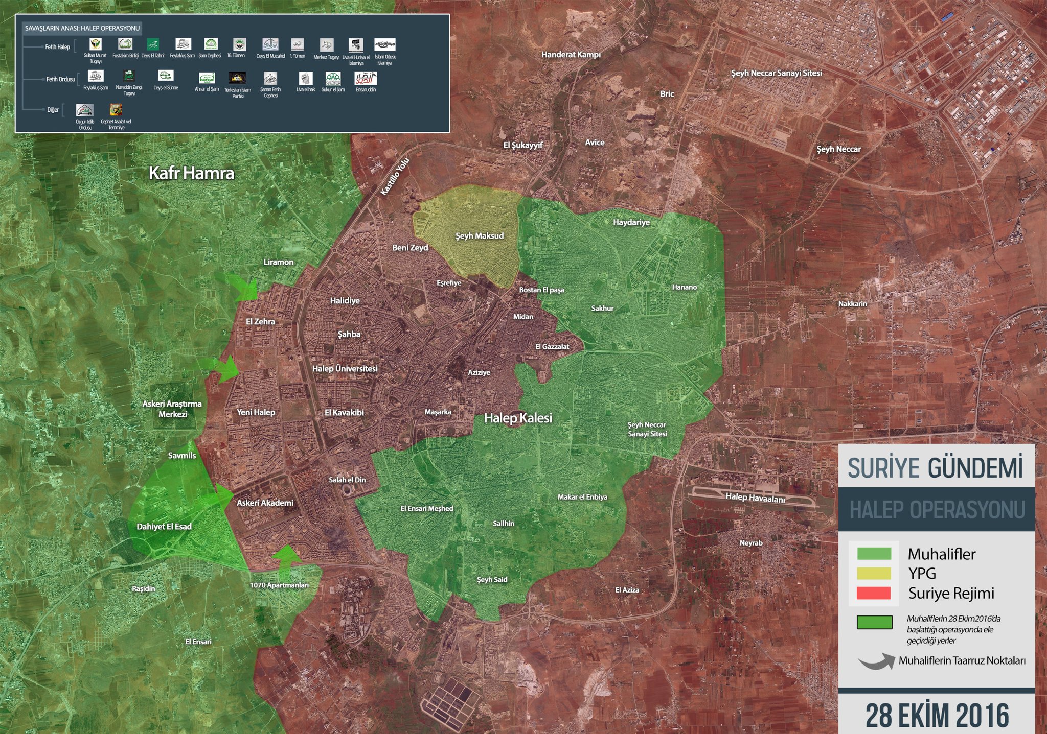 Po zajęciu Dabik i położonych wokół wiosek rebelianci ruszyli dalej na południe, w kierunku jeziora Shahba, gdzie z ofensywą przeciwko IS wystartowały także Syryjskie Siły Demokratyczne w kantonie Afrin. SDF w Afrin jeszcze we wrześniu tego roku zajęło kilka wiosek kontrolowanych przez IS w tym rejonie, natomiast w ostatnich dniach poczyniło dalsze postępy i zdobyło kolejne miejscowości w pobliżu jeziora oraz przybliżyło się nieco do Al-Bab, tworząc jednocześnie strefę buforową między wojskami rządowymi stacjonującymi w okolicach Aleppo (SDF i armia rządowa utrzymują rozejm) i nadciągającymi z północy rebeliantami. Turkom i wspieranym przez nich bojownikom działającym w ramach Tarczy Eufratu udało się zapobiec zajęciu przez SDF miasta Dżarabulus, a także opanowaniu przez tę organizację ostatniego kawałka granicy turecko-syryjskiej kontrolowanej przez IS. Jednym z celów operacji było jednak także zajęcie miasta Al-Bab i zapobieżenie połączaniu się kantonu Afrin z resztą Rożawy, tak więc rozpoczęta 18 października ofensywa SDF w kierunku Al-Bab nie została przyjaźnie odebrana przez Turków i wspierane przez nią frakcje i musiała doprowadzić do konfrontacji między tymi stronami. Tego samego dnia jedna z brygad rebelianckich zażądała opuszczenia miasta Tall Rifaat, które zostało zajęte przez SDF na początku tego roku. Warto tu przypomnieć, że konflikt między SDF/YPG a islamistami i rebeliantami (nie tylko w północnym Aleppo) ma długą historię, a jedne z najpoważniejszych walk toczyły się w lutym tego roku, gdy region Aleppo i okolice Afrin były miejscem zaciętej bitwy wojsk rządowych i oddziałów SDF z siłami antyrządowymi.